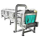 本機為成品罐表面清掃設備,能對罐圓周、罐頂及罐底進行全方位吹掃; 罐子由兩條速度不一樣的圓形皮帶帶動,使罐子在走動時可以轉動,使安裝在兩邊的毛刷到刷到罐身的每個地方;